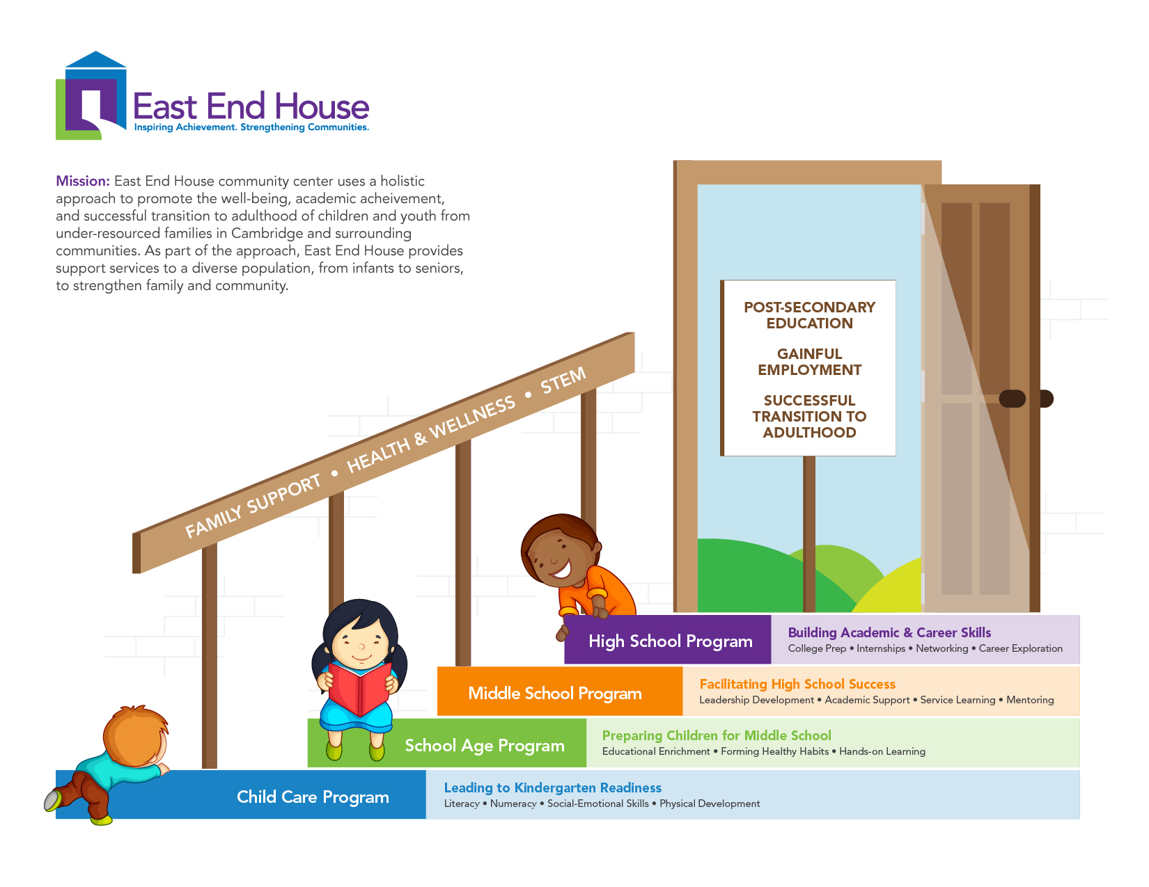 East End House community center uses a holistic approach to promote the well-being, academic achievement, and successful transition to adulthood of children and youth from under-resourced families in Cambridge and surrounding communities. As part of this approach, East End House provides support services to a diverse population, from infants to seniors, to strengthen family and community.